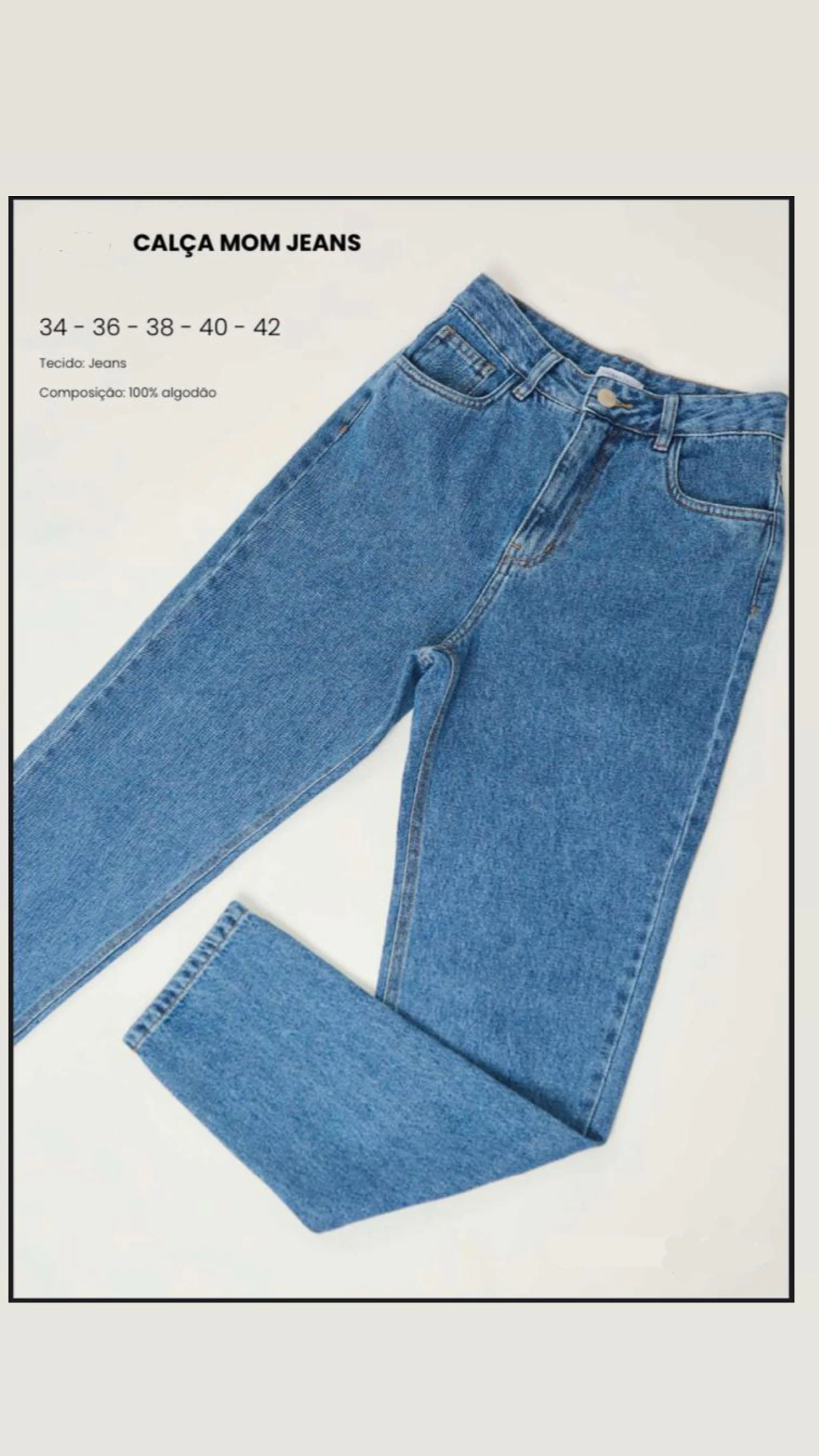 Com modelagem menos justa, cintura alta - valorizando a silhueta -, a Mom Jeans é uma das queridinhas do momento. Na lavagem azul médio, com uma pegada mais retrô. Versátil e linda! - Composição: 100% algodão *Confecção com recorte maior.